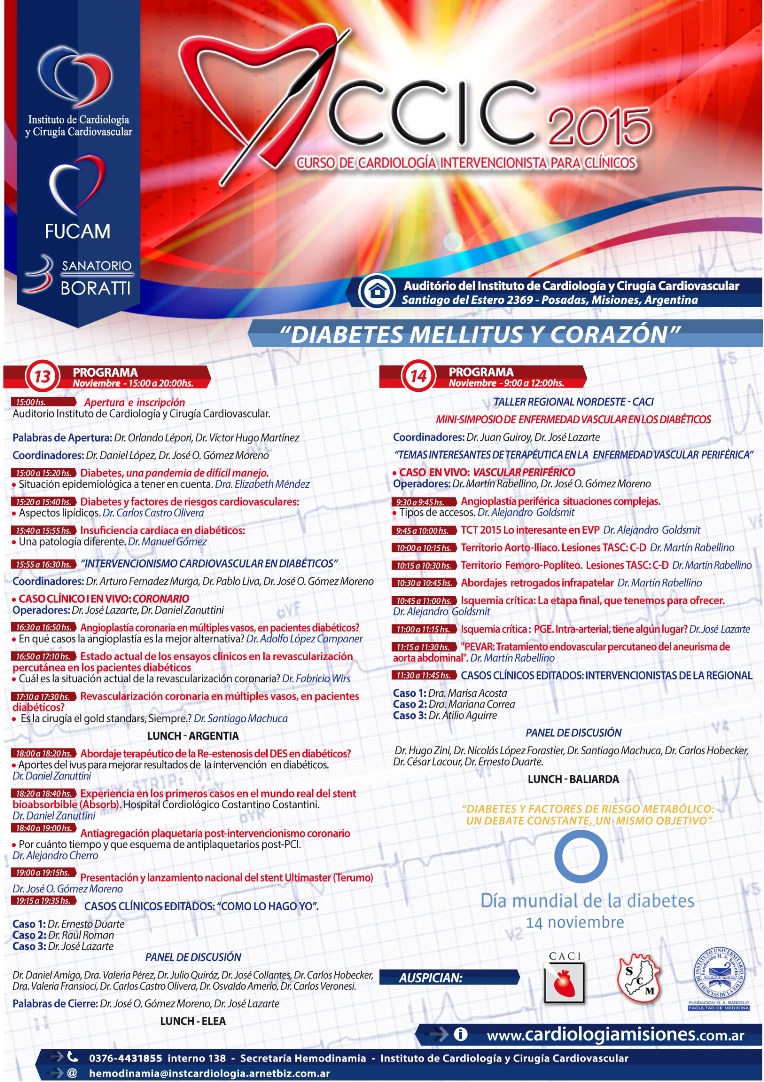 09/11/15. Cronograma Viernes 13 de Noviembre10:00 hsApertura e inscripciónAuditorio Instituto de Cardiología y Cirugía Cardiovascular.Palabras de Apertura: Dr. Orlando Lépori, Dr. Víctor Hugo MartínezCoordinadores: Dr. Daniel López, Dr. José O. Gómez Moreno15:00 a 15:20 hsDiabetes, una pandemia de difícil