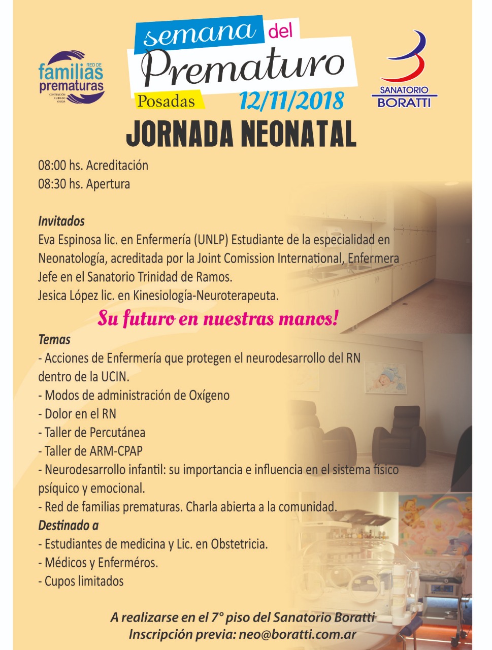 05/11/18. EN LA SEMANA DEL PREMATURO LOS INVITAMOS CORDIALMENTE A PARTICIPAR DE LA JORNADA NEONATAL EL DÍA 12 DE NOVIEMBRE DE 2018EN EL SANATORIO BORATTI, 7° PISO ACCESO CALLE SAN LUISA PARTIR DE LAS08:00HS: ACREDITACIÓN 08:30HS: APERTURADESTINADO ESTUDIANTES DE MEDICIA, MÉDICOS Y ENFERMEROS.
